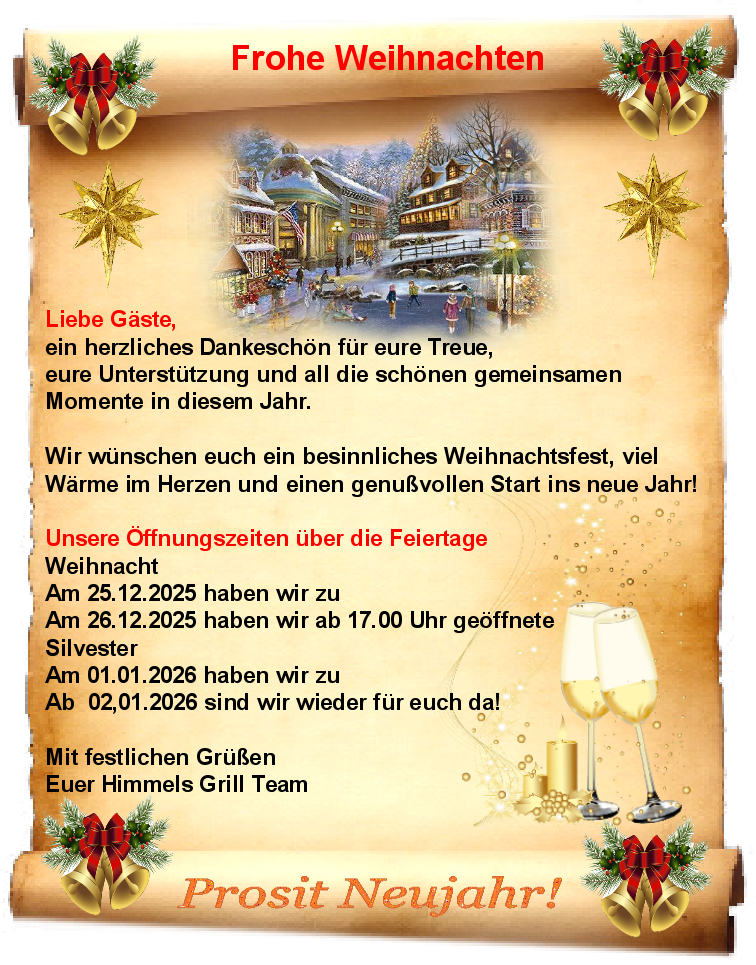 Himmels Grill Himmelstraße.1 59387 Ascheberg Öffnungszeiten von Mo. - Fr. 11.30 - 22.00 & von Sa. - So. 12.30 - 22.00 Uhr Telefon: 02593/4979709